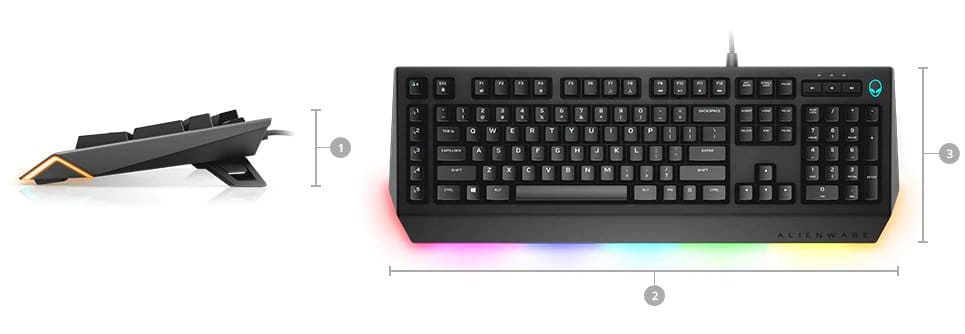 Dimensions & Weight1. Height: 1.37 (34.8mm) without legs | 2.13 (54.2mm) with legs | 2. Width: 19.65 (499mm) | 3. Depth: 6.76 (171.8mm) | Weight: 3.26lbs (1460g) Features1. Iconic Alienware design with AlienFX 16.8M RGB Ambient Lighting2. Brown mechanical keys3. 50million cycle life4. 45g actuation force5. 60g tactile force6. 2mm actuation distance7. 4mm total travel distance8. Less than 5ms bounce time (during actuation speed of 0.4 m/s)9. 1000 Hz (1ms) polling rate10. Anti-Ghosting and N-key rollover on all keys11. 5 programmable macro key functions with software recording12. All programmable keys13. 3 adjustable leg angles14. Multimedia keys15. Optional Palm Rest (sold separately) TECH SPECS Device TypeKeyboard Width19.65 inch (499mm) Weight3.26 lbs (1460g) Height1.37 inch (34.8mm) without legs2.13 inch (54.2mm) with legs Depth6.76 inch (171.8 mm)