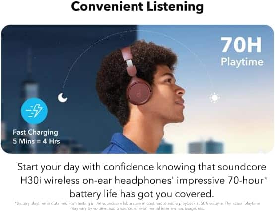 Designed for long-lasting usage, the Anker soundcore H30i wireless headphones offer an impressive 70 hours of playtime on a single charge, eliminating battery anxiety for extended travels or long workdays. Anker’s testing confirms this battery life during continuous playback at moderate volume. With real-world variables, playtime may vary, but users can count on extensive hours of reliable listening.