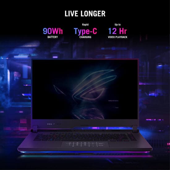For on-the-go gaming sessions, the Strix G provides the freedom to unplug and continue your activities with its high-capacity 90Wh battery. Enjoy extended relaxation time away from power outlets, as the laptop offers up to 12 hours of video playback. When you do need to recharge, the Strix G supports fast charging, capable of reaching 50% battery capacity in just 30 minutes. Alternatively, you can conveniently charge on-the-go using the USB Type-C port, allowing you to power up from a compatible battery pack of your choice.