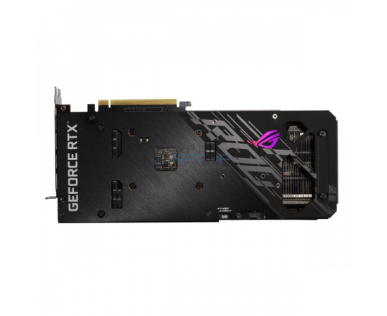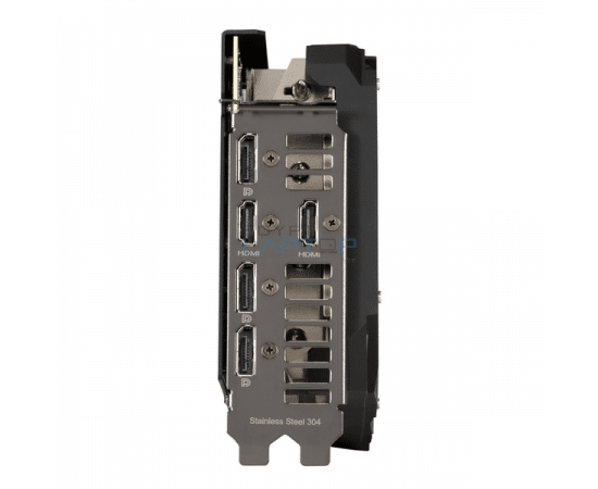 Turn the card over and see if the design is further improved. To improve heat dissipation, wide back panel vents and a short PCB allow hot air to escape to the chassis exhaust fan instead of returning to the heatsink. The I / O brackets are made of stainless steel to protect the ports and provide a safer mounting. A convenient location with dual BIOS switches allows you to quickly switch between performance mode and silent mode to basically fine-tune the card’s default behavior without software. In addition, the ROG logo with addressable RGB lighting adds more flare.