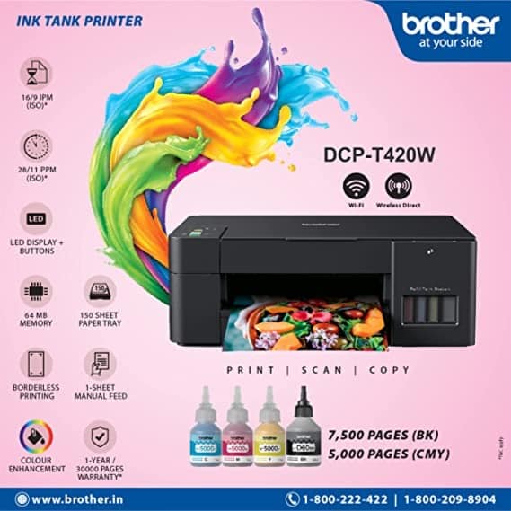 The Brother DCP-T420W InkTank All-In-One Printer is a versatile printer designed for home and small office use. It is part of Brother’s InkTank series, which is known for its high-capacity ink tanks that can print thousands of pages before needing a refill.