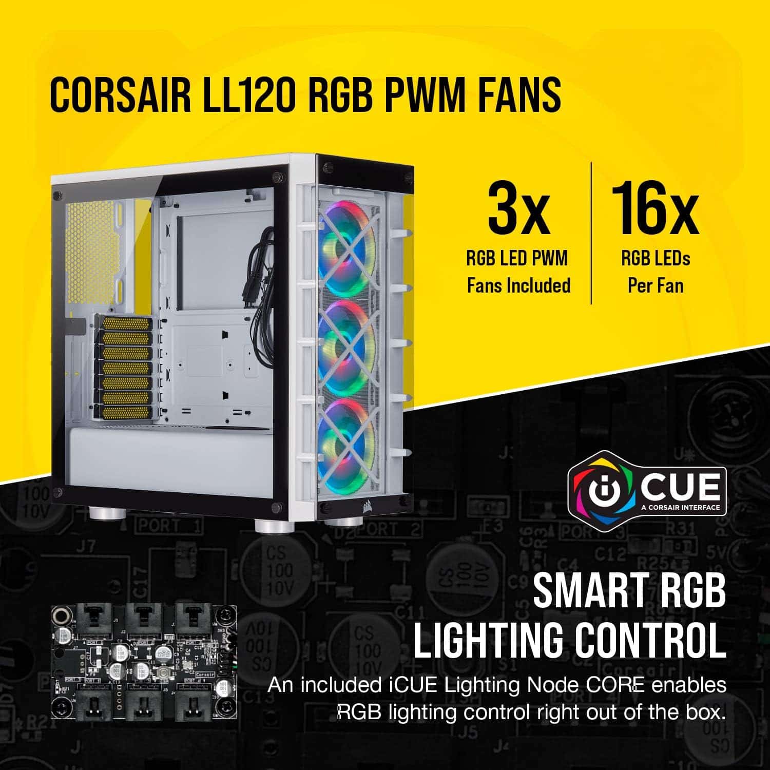 Includes three Corsair LL120 RGB cooling fans that deliver powerful airflow Up to 1, 500 RPM, with 16 RGB LEDs per fan and seven mesmerizing preset iCUE lighting profiles