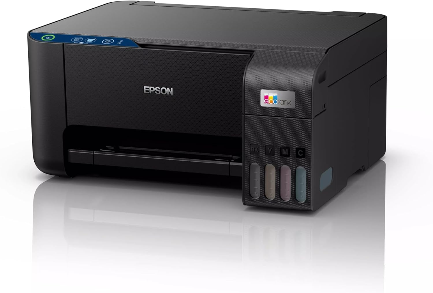 The printer features a space-saving design with front-facing ink tanks for easy monitoring and refilling. It fits perfectly into small desks or workspaces.