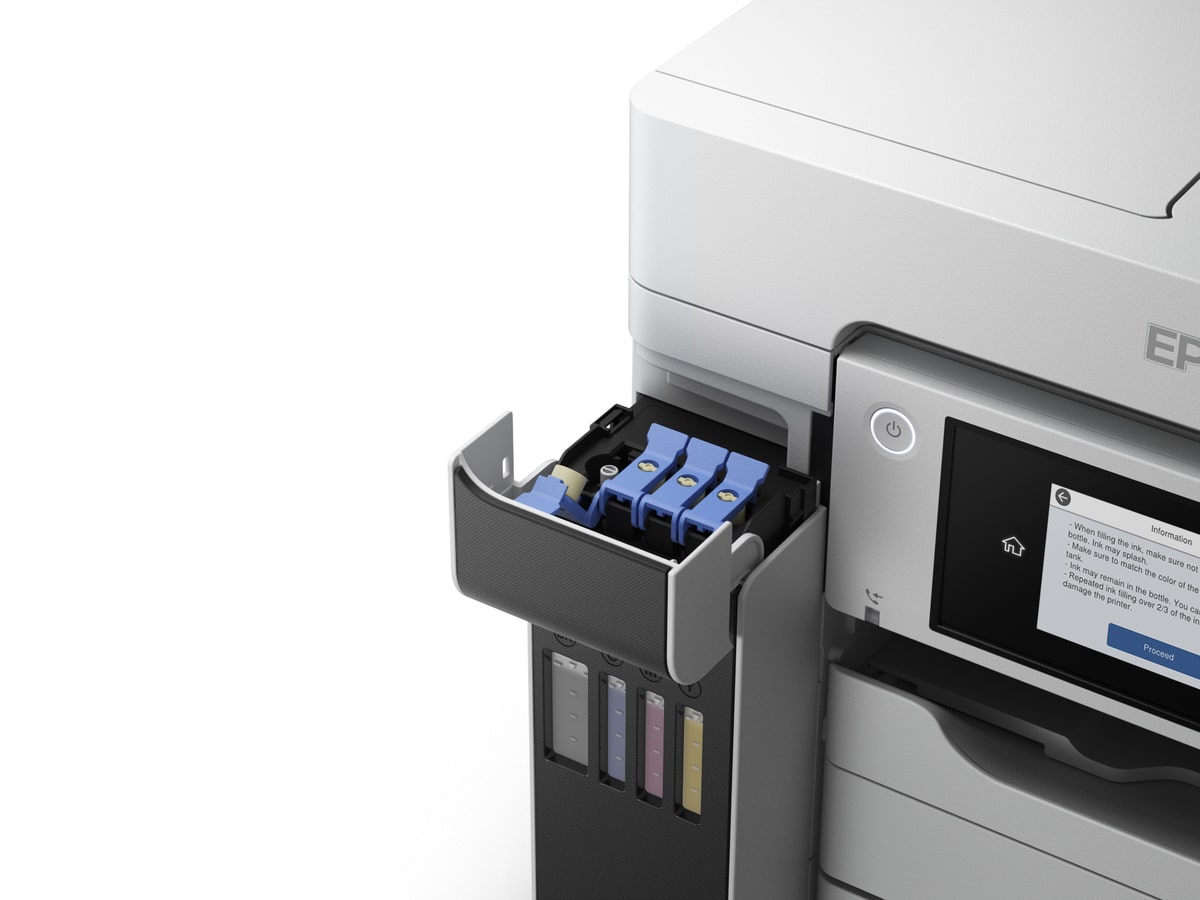 | Features | Ultra-fast print and scan speeds Up to 25ppm Ultra-low-cost per page Economical ink tank system Easy to use front ink tank Enjoy hassle and mess-free refills with enhanced ink bottles Mobile printing and connectivity Wi-Fi, Wi-Fi Direct, Ethernet & free mobile printing apps Designed for business 2x A4 250-sheet front tray, 50-sheet rear feed, 50-sheet A4 ADF |