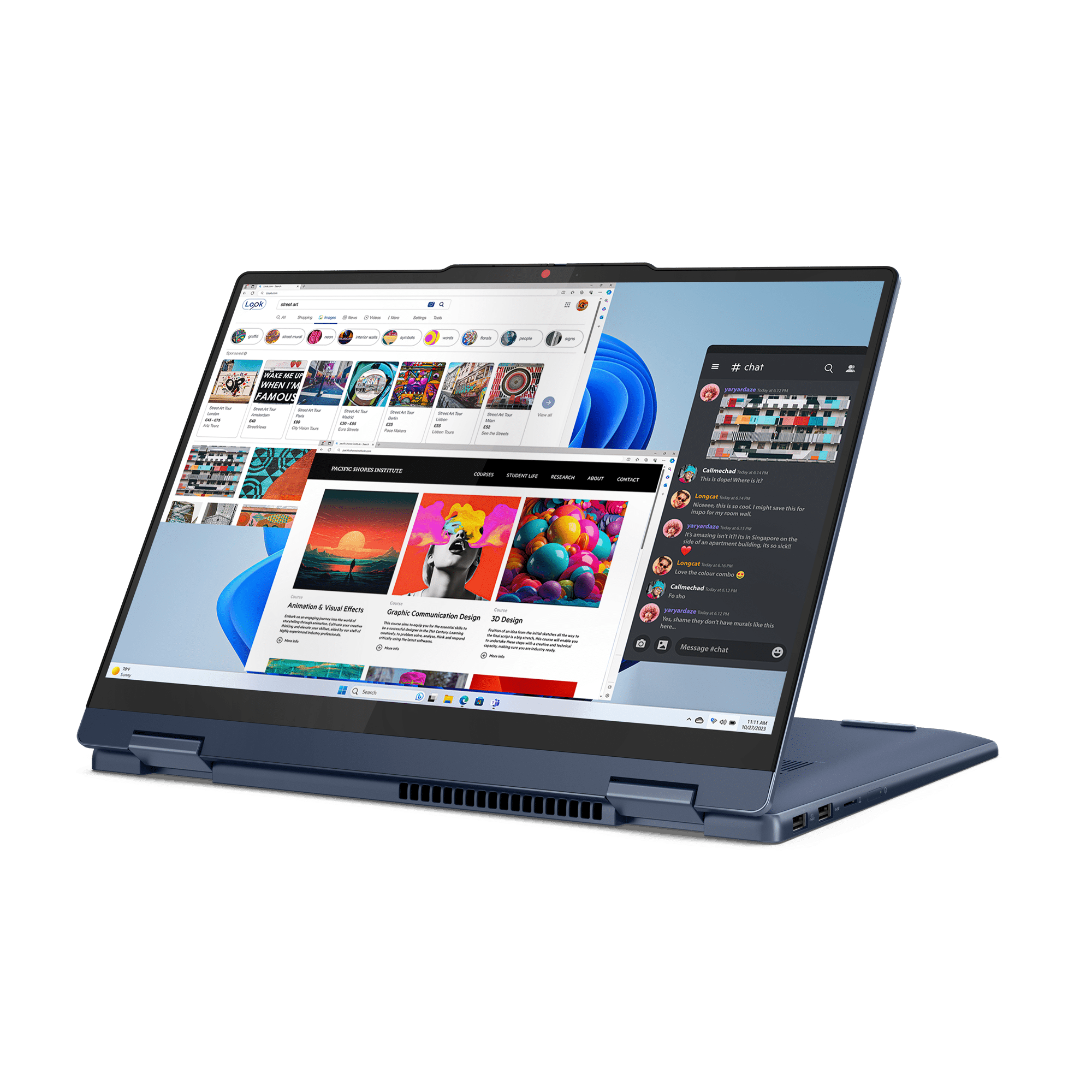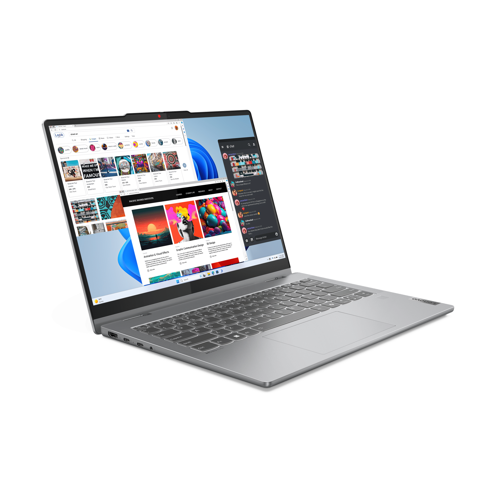 A person viewing a daily vlog video on the Lenovo IdeaPad 5 2-in-1 Gen 9 (14 inch AMD) laptop in Luna grey with a focus on the front, left side view of the laptop placed on a desk in tent mode.Power & Performance to Do MoreGet power boost in every task you’re involved in with the 14″ Lenovo IdeaPad 5 2-in-1 Gen 9 laptop, driven by AMD Ryzen™ processors. Whether you’re streaming, editing content, or handling complex business tasks, it delivers superior performance and efficiency on the go.  And, with AMD Radeon™ Graphics, you’re sure to enjoy sharp, lifelike visuals like never before. What’s more, multitask like a pro with ample storage and responsive memory that facilitate seamless project execution and easy data access, at any time of the day.Front view of the Lenovo IdeaPad 5 2-in-1 Gen 9 (14 inch AMD) Luna Grey laptop in stand mode, focusing its screen that differentiates an OLED display on the right from a normal display on the left.Not Less than a Visual TreatEnjoy every visual on the 14″ IdeaPad 5 2-in-1 Gen9 laptop that flexes narrow bezels and a dynamic display. With ample screen real estate, immerse yourself in a world of vibrant colors and crisp details, bringing your content to life. Its intense color contrasts vividly separates deep darks from bright lights — thanks to its precise color accuracy. Plus, with TÜV Rheinland Certified Low Blue Light, rest assured over prolonged working sessions without stressing your eyes. A view showcasing four Lenovo IdeaPad 5 2-in-1 Gen 9 (14 inch AMD) laptops in Luna Grey placed in four different modes namely tent, stand, laptop, & tablet mode with same wallpaper displayed on their screens.Bend, Flex, & Work — 360 DegreesWith a 360-degree convertible design, this laptop boasts flexibility on the go. Type, touch, stream, or collaborate — its ergonomic design and structure adapts to every task, easily.  Its mode versatility enables a smooth transition between laptop, tablet, tent, or stand modes to best suit your needs — whether working or playing. Plus, its available in elegant Luna Grey and cool Cosmic Blue colors to match your personal aesthetics.Cut-short view of the Lenovo IdeaPad 5 2-in-1 Gen 9 (14 inch AMD) laptop’s keyboard in Luna Grey, focusing an illustration of the fingerprint sensor emerging from its right side, underneath the numeric keypad.Fast, Flexible, & SecureBoost your creativity and workflow with swift data transfers, smart connectivity, and a rapid-charging battery. This versatile 2-in-1 laptop allows instant and secure device access via a single touch fingerprint sensor and supports ultra-sharp video calls with a high-definition camera.  Additionally, it comes with a webcam privacy shutter when you wish to stay out of sight. So, unlock limitless potential with endless possibilities.Front view of the Lenovo IdeaPad 5 2-in-1 Gen 9 (14 inch AMD) Luna Grey laptop in tablet mode, slightly tilted from the left, focusing different apps on the screen & a Lenovo Digital Pen placed on the right side.Smart Tech for Smart WorkEnhance your productive edge on the 14″ IdeaPad 5 2-in-1 Gen 9 laptop with Lenovo AI Engine. Its Smart Wireless feature enables seamless online streaming and collaborations, resolving connectivity issues before you even notice them. Plus, it comes with an optional Lenovo Digital Pen that activates Smart Note app, allowing for easy sketching, note-taking, signing docs, or even turning handwriting into digital text — all while boosting your routine efficiency.