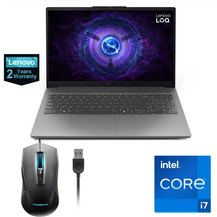Lenovo LOQ 15IAX9E Gaming Laptop- Intel Ci7-12650HX- 16GB RAM- 512GB SSD- NVIDIA GeForce RTX 4050 6GB GDDR6- 15.6″ FHD (1920×1080) IPS 300nits Anti-glare, 144Hz- Luna Grey, 2 Years Warranty RGB Mouse (83LK006UED)