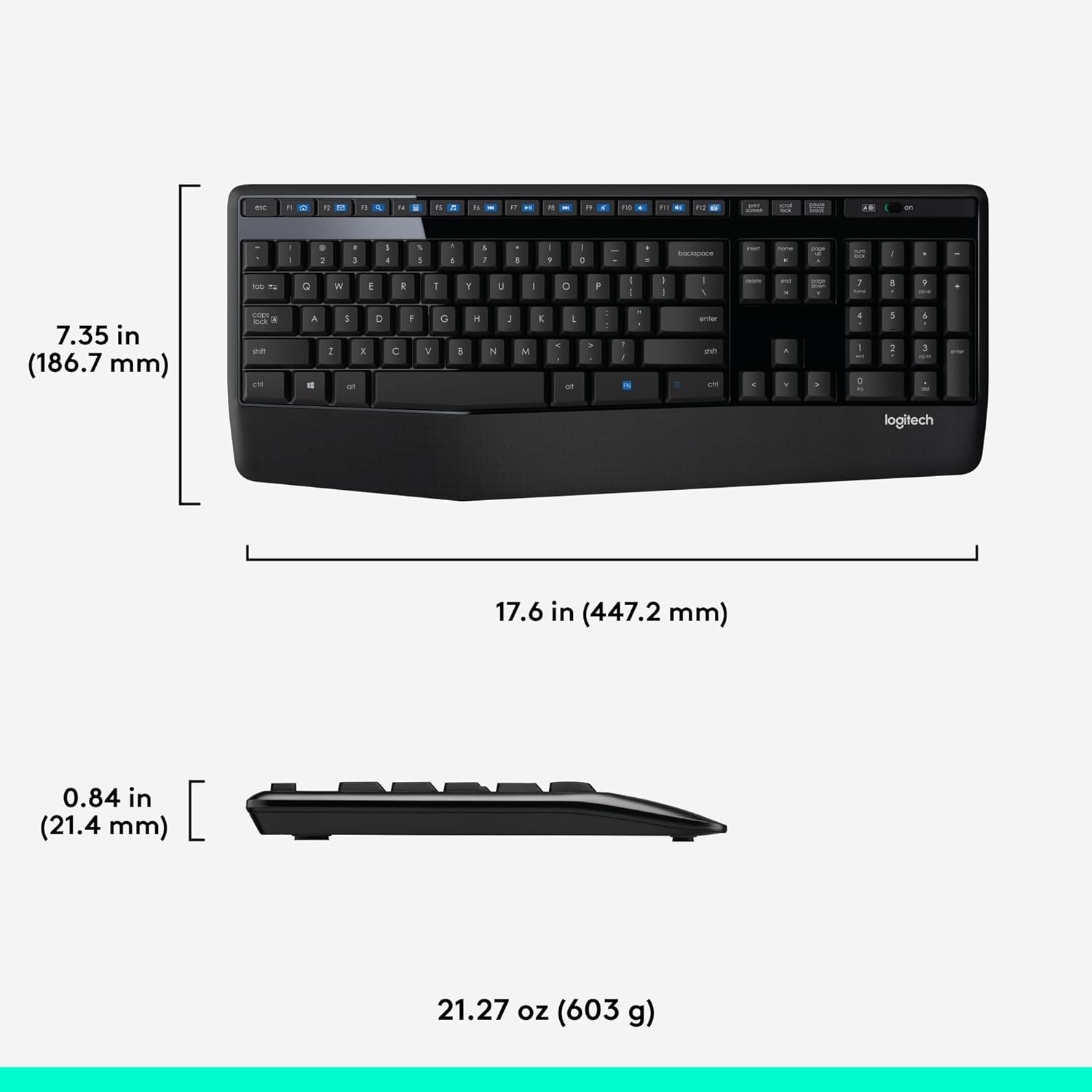 Comfortable, quiet typing on a familiar full-size keyboard layout with generous palm rest, adjustable keyboard height and easy-access media keys like mute, volume and play. The number pad is ideal for data entry, calculations and navigation, so you can get more work done -at home or at work.