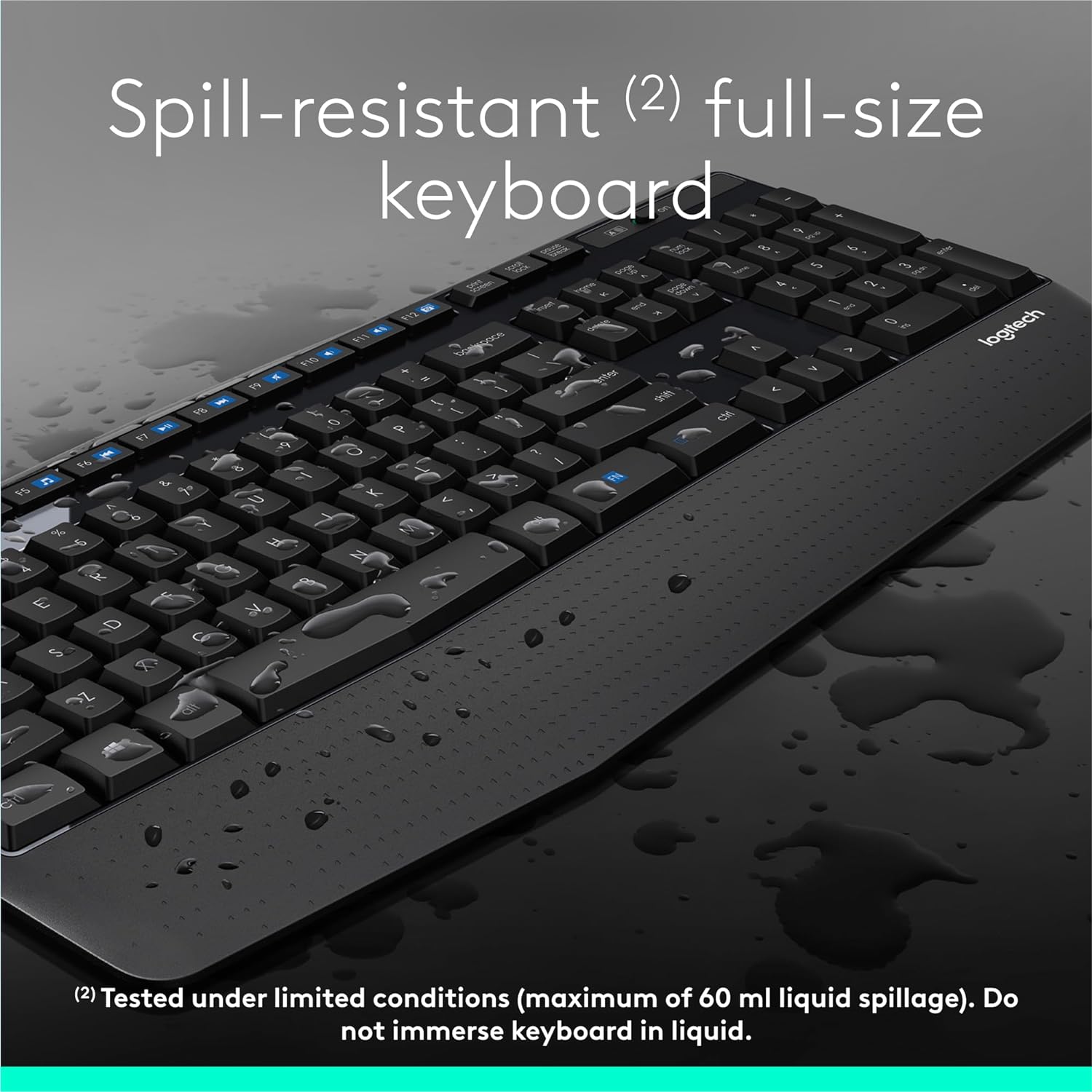 The keyboard comes with a spill-resistant design6Tested under limited conditions (maximum of 60 ml liquid spillage). Do not immerse the keyboard in liquid., durable keys and sturdy tilt legs with adjustable height. A 36-month keyboard and 18-month mouse battery life7Keyboard and mouse battery life may vary based on user and computing conditions-along with on/off switches—means you can go for months without the hassle of changing batteries.