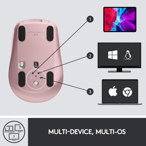 MX Anywhere 3S is compatible with all major operating systems5Device basic functions will be supported without software for operating systems other than Windows and macOS right out of the box – works with Windows, macOS, Linux6Device basic functions will be supported without software for operating systems other than Windows and macOS, ChromeOS7Device basic functions will be supported without software for operating systems other than Windows and macOS, iPadOS8Device basic functions will be supported without software for operating systems other than Windows and macOS, and Android9Device basic functions will be supported without software for operating systems other than Windows and macOS.Easily pair MX Anywhere 3S via Bluetooth® Low Energy with up to three devices and switch between them at the push of a button. Bluetooth makes it easy to connect and frees up your USB ports for other devices.Not into Bluetooth? MX Anywhere 3S is compatible with Logi Bolt USB receiver (sold separately)10The mouse is not compatible with other Logitech USB receivers.