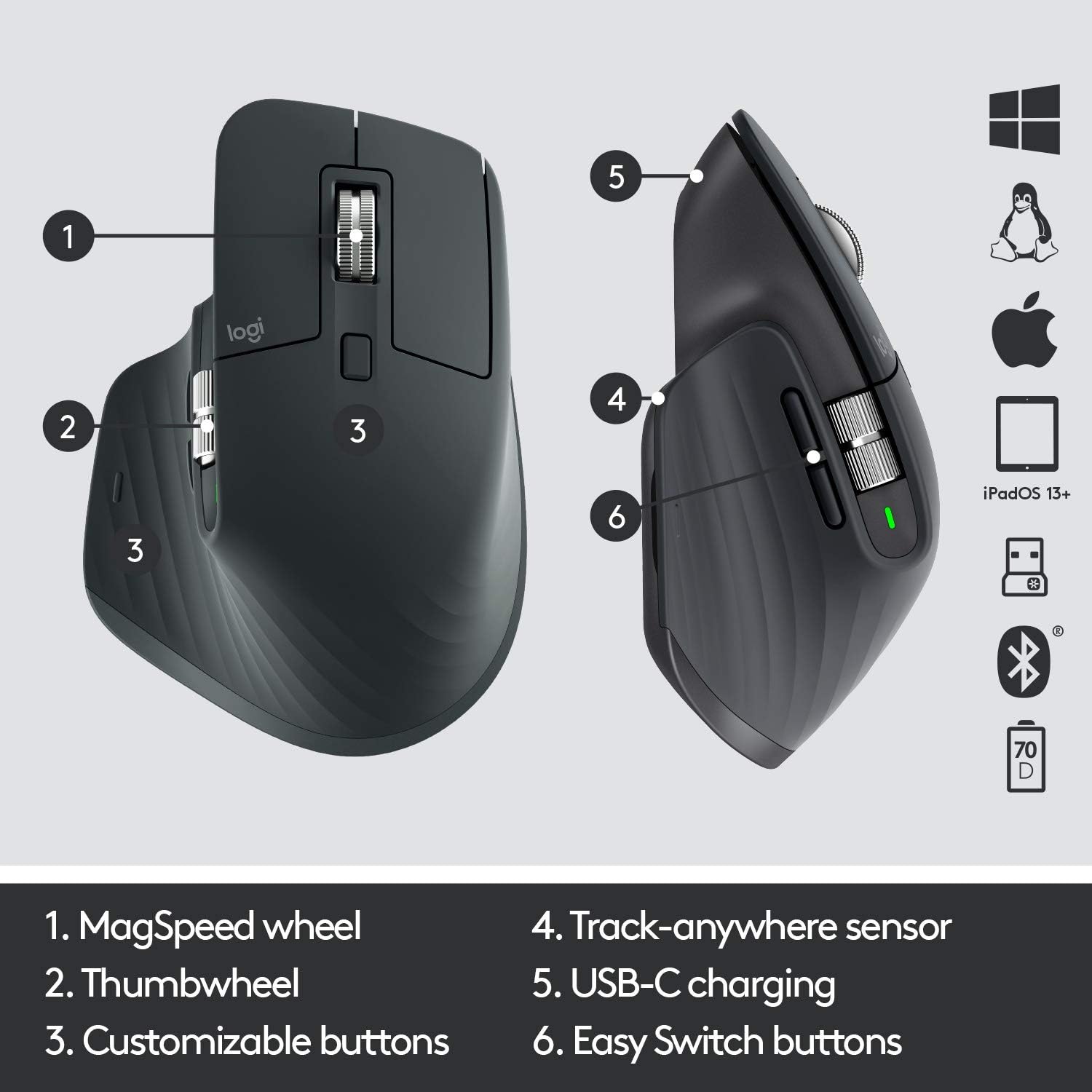 MX Master 3S stays powered for up to 70 days on a full charge – and gets three hours of use from a one-minute quick charge*.*Battery life may vary based on user and computing conditions.