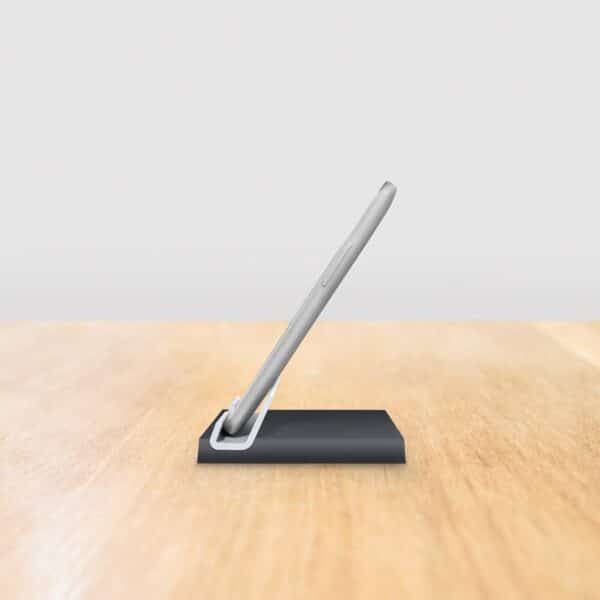 Clean up your desk with this space-saving stand for your phone or tablet. It securely holds a variety of devices at the perfect angle to read and type. Its non-slip rubber construction keeps your mobile screen stable, and the design allows easy access to the phone or tablet home key.6Most phones and tablets up to 10.5 mm (0.4 inches) thick.