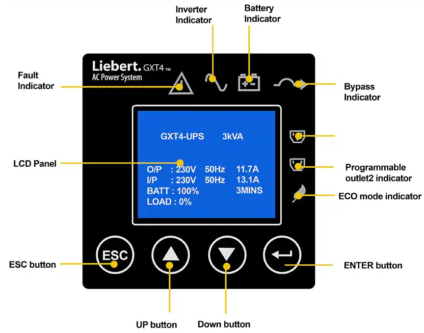 For increased energy efficiency, the UPS features an Active ECO mode. This mode helps save power by optimizing the system’s operation without compromising on reliability or performance. Users can easily access UPS information through a user-friendly, multi-language LCD display, providing essential data at a glance.