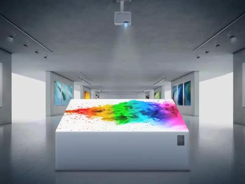The projector can freely rotate at any angle vertically to aid with creative applications, allowing projection onto ceilings, walls, or angled signage.